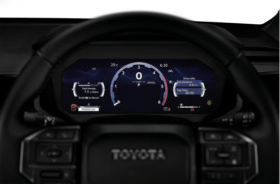 The interior of the new generation Hilux has undergone substantial changes. Step inside, and the cabin evokes a sensation reminiscent of the Land Cruiser. In the center of the horizontally extended dashboard, there's a built-in 12.3-inch touchscreen, and in front of it, there's an equally sized fully digital instrument panel with a very clear display.