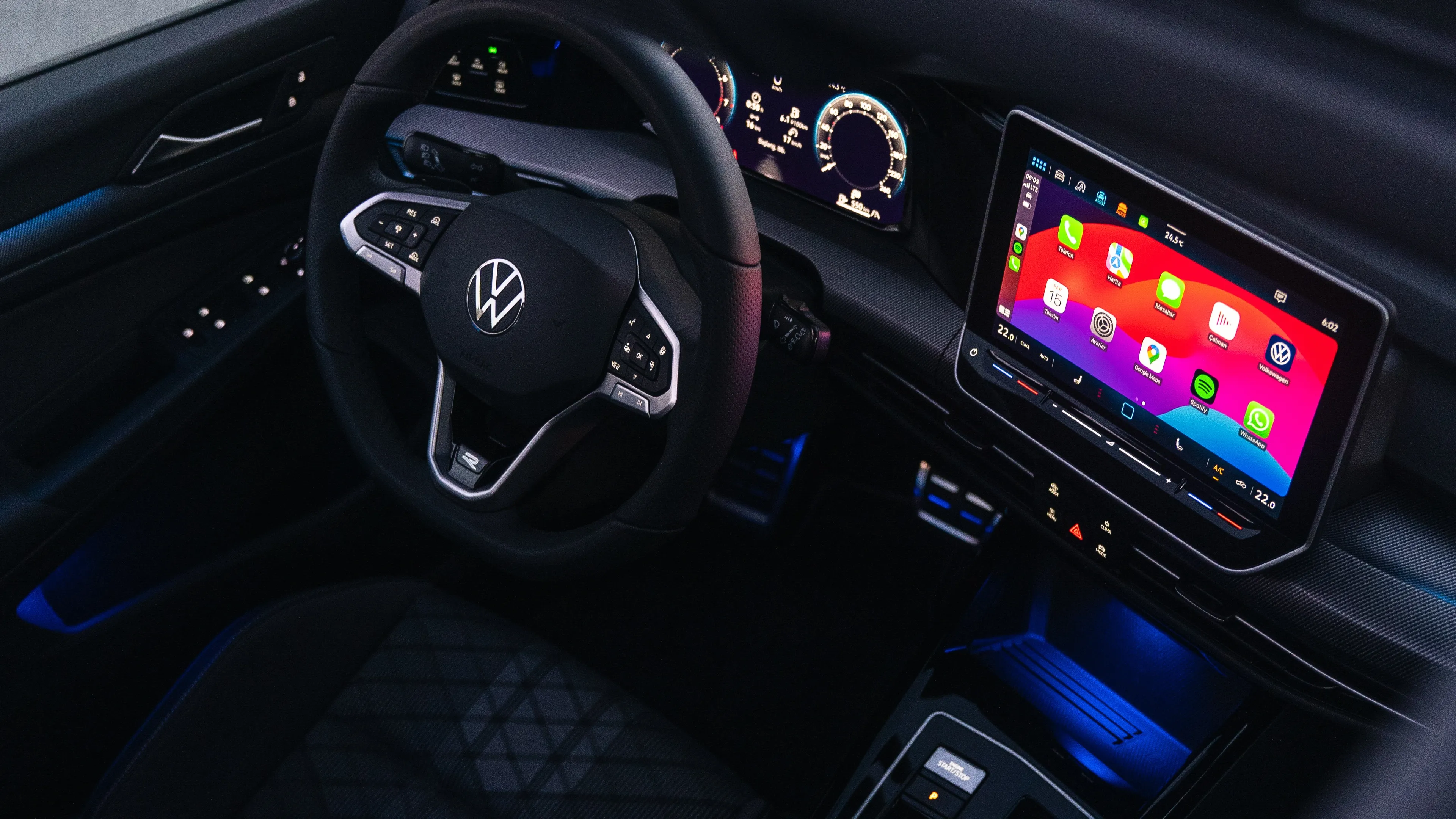 The R-Line treatment extends inside with exclusives like a black roof liner, brushed stainless steel pedals, Carbon Grey interior trim, and sport seats upholstered in a fabric and ArtVelours blend. The three-zone automatic air conditioning system with an allergen filter ensures a more comfortable travel experience every time.