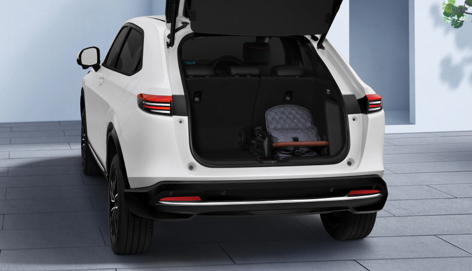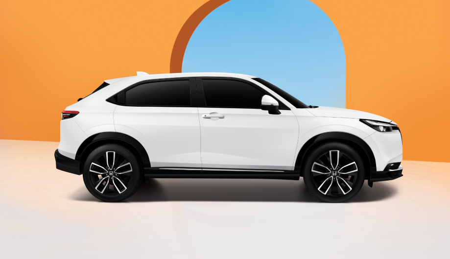 The Honda HR-V features a sharp-angle front grille combined with a full LED lighting system, 18-inch alloy wheels, and auto-folding side mirrors, projecting a confident and sporty stance. Its interior showcases a floating audio display system and dual-zone automatic air conditioning for a sense of technology.