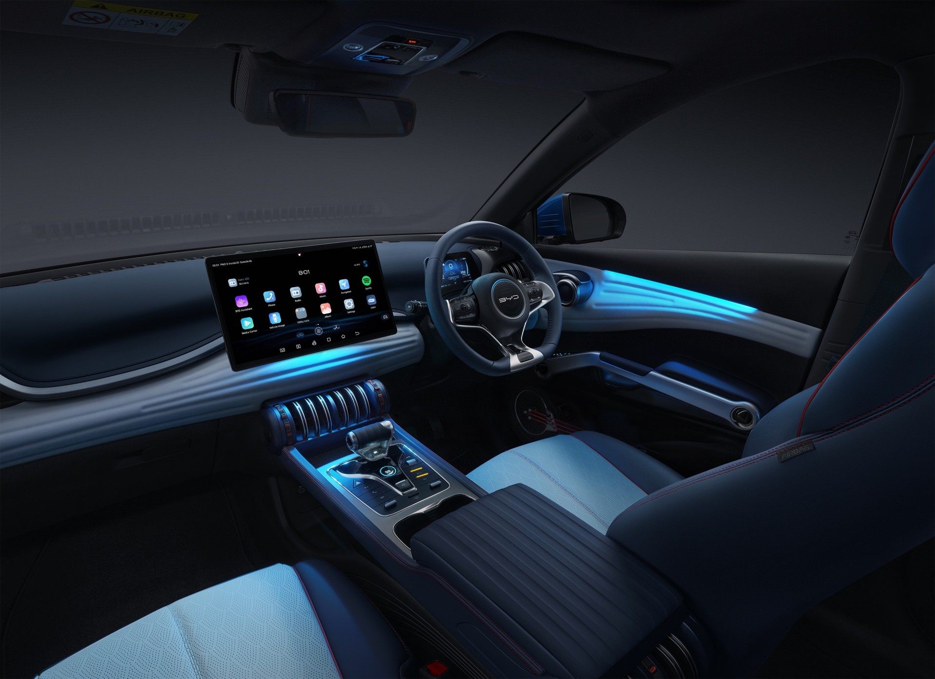 The BYD Atto 3's cabin embraces a refined yet vibrant aesthetic. It incorporates flowing curves and an asymmetrical center console design, complemented by soft-touch surfaces, leather upholstery, and metallic accents, all tied together with a youthful color scheme.