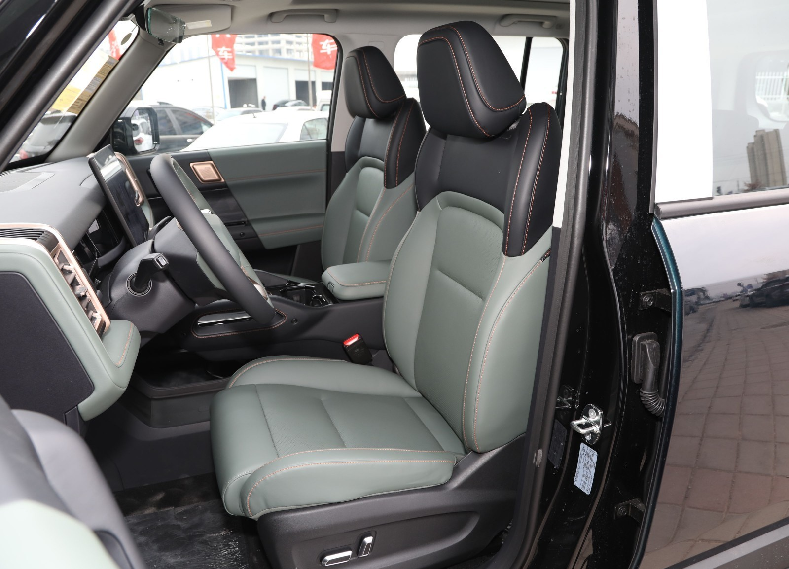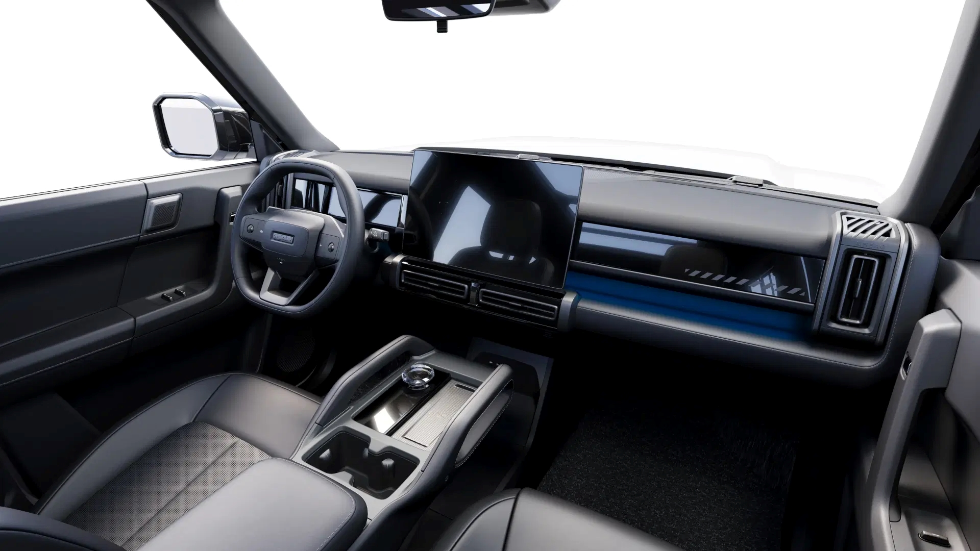 Inside, the iCaur 03 adopts a rugged, tech-focused theme. Straight lines and rectangular elements echo its exterior styling. The cabin materials primarily include hard plastics and synthetic leather, accented with aluminum trim to evoke an industrial feel. Higher-spec models further enhance the premium touch with genuine leather stitching.