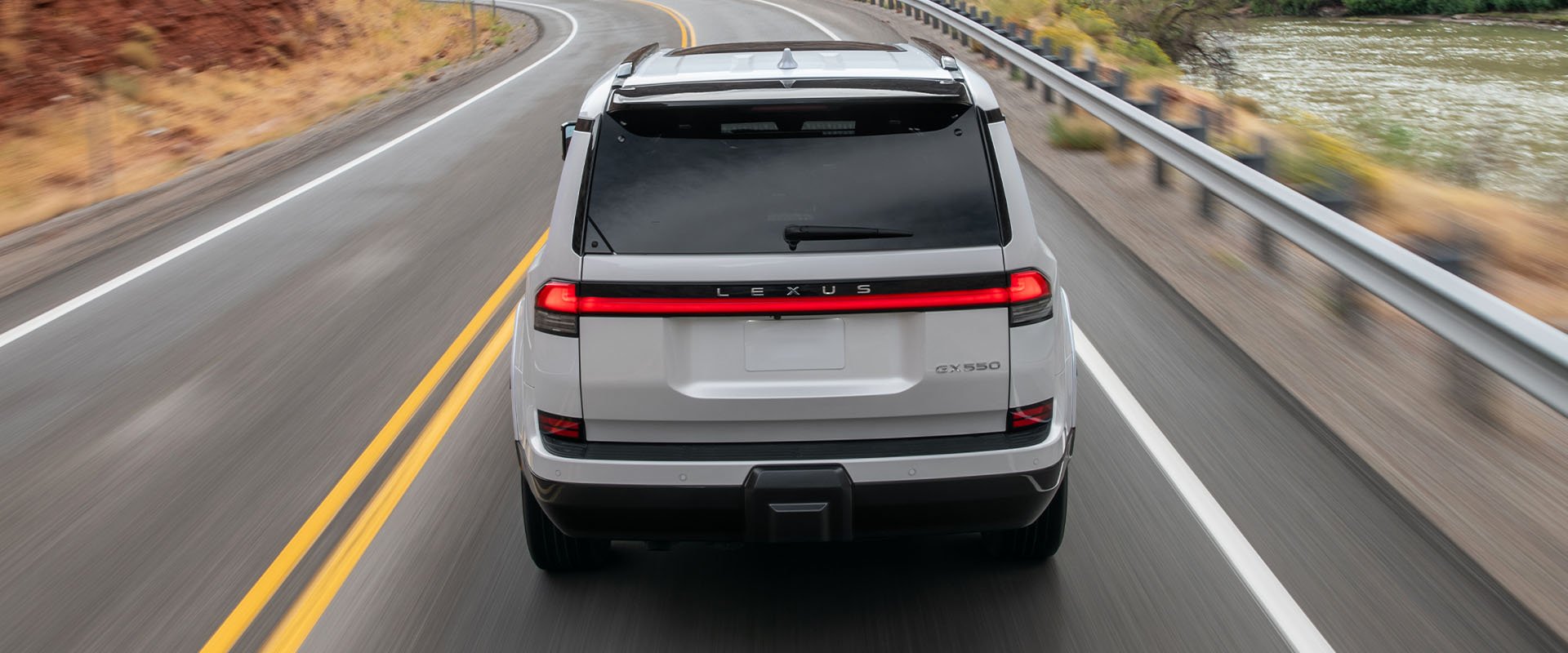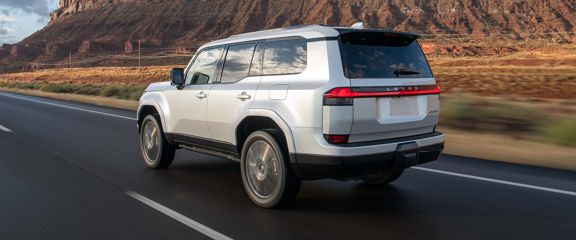 The side profile maintains an upright posture, featuring a floating roof and robust C-pillars that highlight a sense of power. The rear features U-shaped through-type LED taillights and "LEXUS" lettering, paired with a power tailgate (Luxury + adds sensor activation) and an independently openable rear window, combining practicality and style.