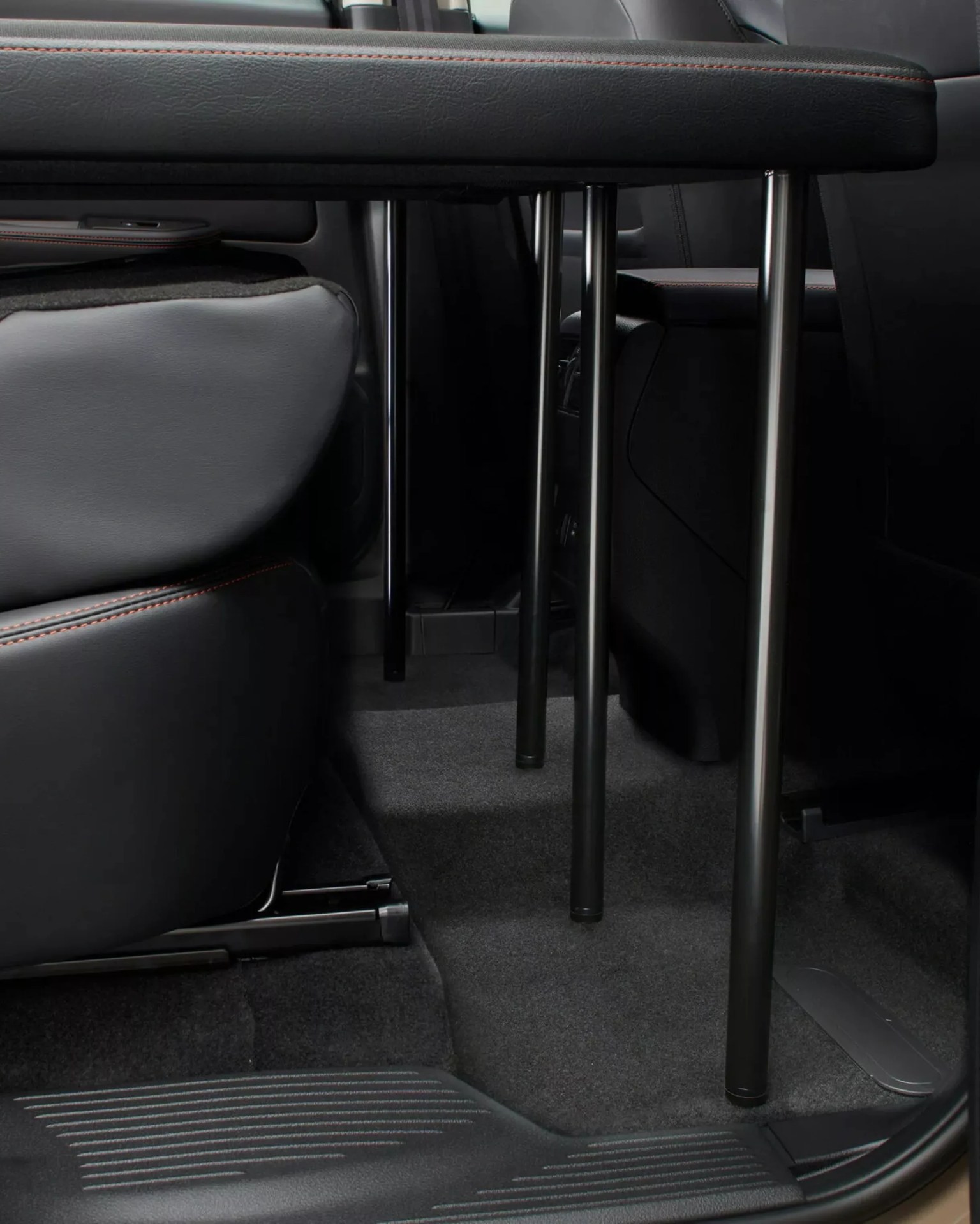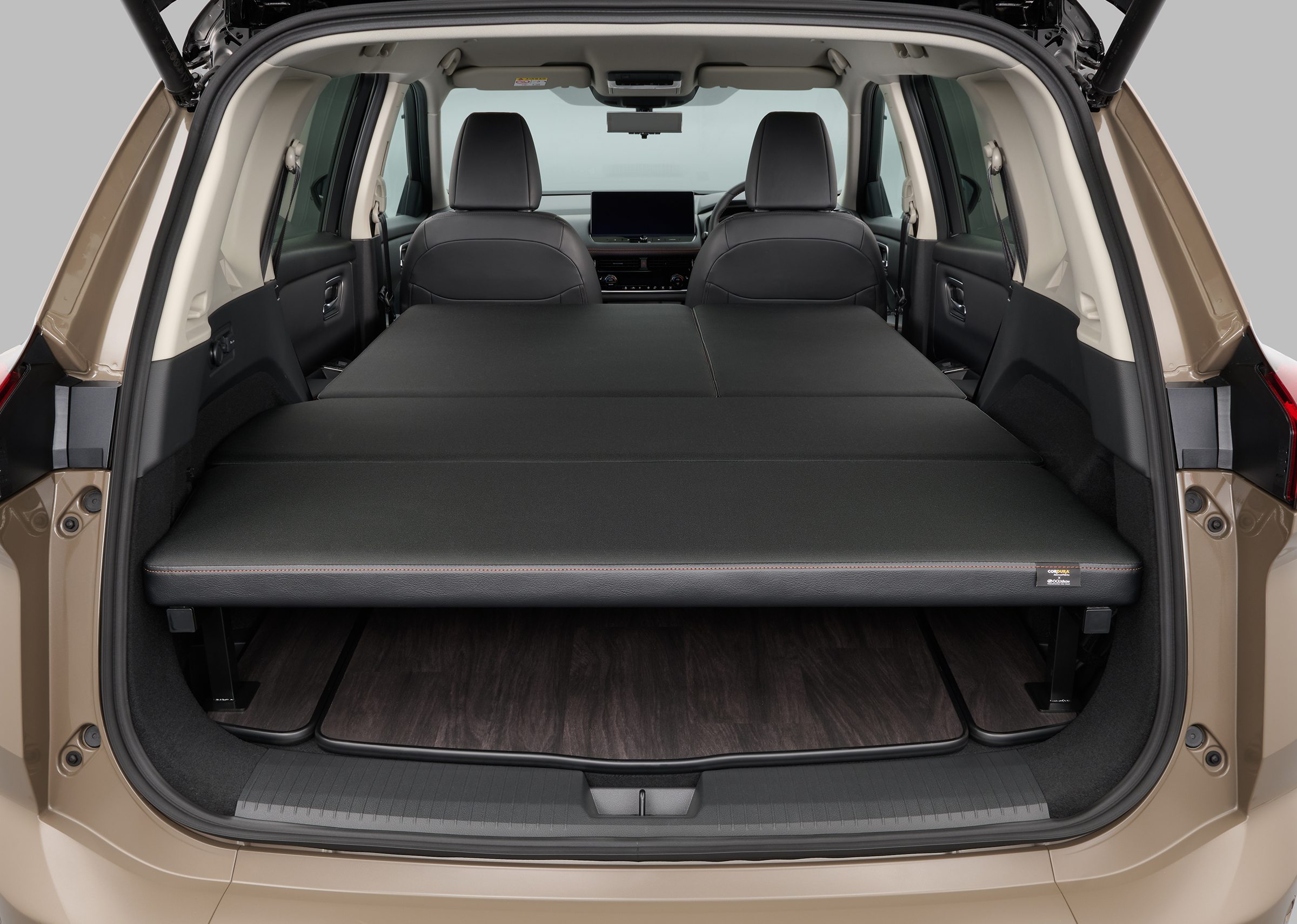 The factory-installed bed system extends directly from the second row of seats into the trunk, eliminating the need for owners to cut, modify, or purchase additional accessories, creating a seamless, flat sleeping space.