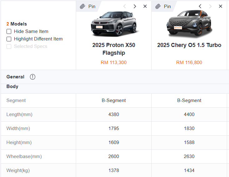 Configuration Comparison Between Proton X50 and Chery Omoda 5