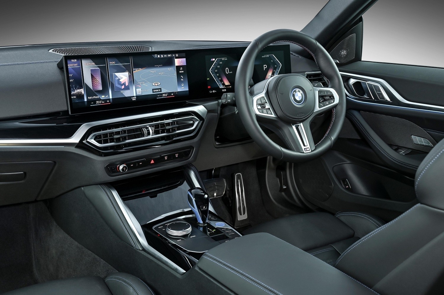 ภายในของ BMW i4 มอบประสบการณ์ล้ำสมัยด้วย BMW Curved Display ที่รวมหน้าจอขนาด 12.3 นิ้วและ 14.9 นิ้วเข้าไว้ด้วยกัน มีระบบ iDrive 8 ซึ่งควบคุมด้วยเสียงและสัมผัสอย่างง่ายดาย เบาะหนังประณีตพร้อมระบบนวดแถมยังรองรับการเชื่อมต่อไร้สายแบบเต็มรูปแบบ รวมถึงฟีเจอร์อัจฉริยะเช่น Augmented Reality Navigation และระบบเสียง Harman Kardon ที่ทำให้การขับขี่เต็มไปด้วยความบันเทิง