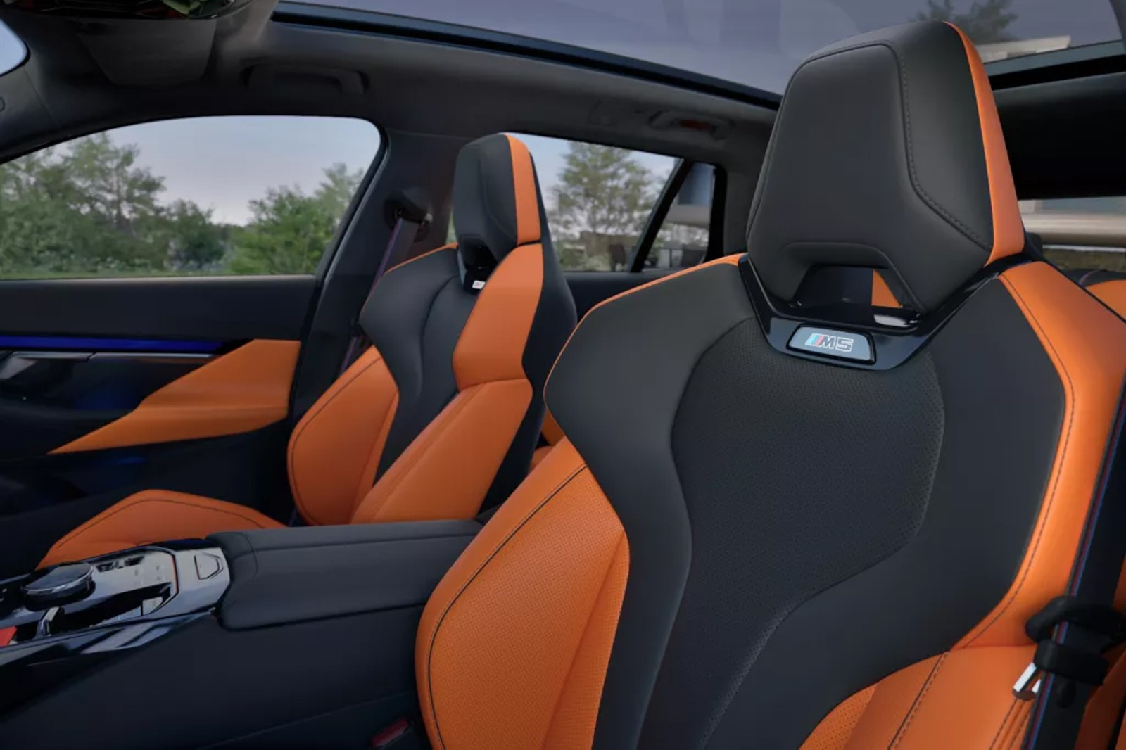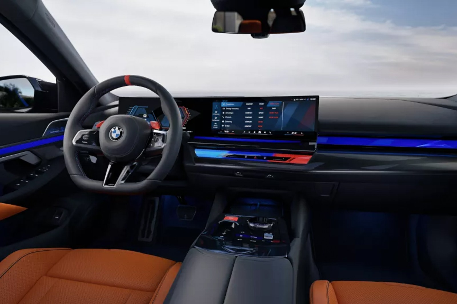 เมื่อก้าวเข้าไปใน BMW M5 Touring ผู้ขับขี่จะพบว่าภายในห้องโดยสารเป็นการผสมผสานที่ลงตัวระหว่างดีไซน์ M อันเป็นเอกลักษณ์และความหรูหราของซีรี่ส์ 5 มาตรวัดความเร็วแบบดิจิทัลโค้งมน ผสานกับจอแสดงผลขนาด 12.3 นิ้ว และหน้าจอสัมผัสระบบมัลติมีเดียขนาด 14.9 นิ้ว ติดตั้งอย่างสวยงามเหนือคอนโซลกลาง ให้ข้อมูลและการเข้าถึงระบบต่างๆ อย่างครบครัน วัสดุระดับพรีเมียมครอบคลุมพื้นที่สัมผัส ตั้งแต่หนังเมอริโนคุณภาพสูง เบาะนั่งไฟฟ้าอเนกประสงค์พร้อมฟังก์ชั่นนวดและระบบทำความร้อน/ความเย็น ตกแต่งด้วยคาร์บอนไฟเบอร์หรืออลูมิเนียมอย่างประณีต พวงมาลัย M แบบสามก้านมีปุ่ม M1 และ M2 สำหรับบันทึกการตั้งค่าการขับขี่ที่ต้องการ ในขณะที่แป้นเปลี่ยนเกียร์ช่วยให้เปลี่ยนเกียร์ได้อย่างรวดเร็วเพียงปลายนิ้วสัมผัส ทำให้การขนส่งอุปกรณ์กีฬาหรือสัมภาระในการเดินทางไกลเป็นเรื่องง่าย สำหรับผู้ที่ต้องการทั้งความตื่นเต้นในการขับขี่และความสะดวกสบายในชีวิตประจำวัน นี่คือสวรรค์อย่างแท้จริง