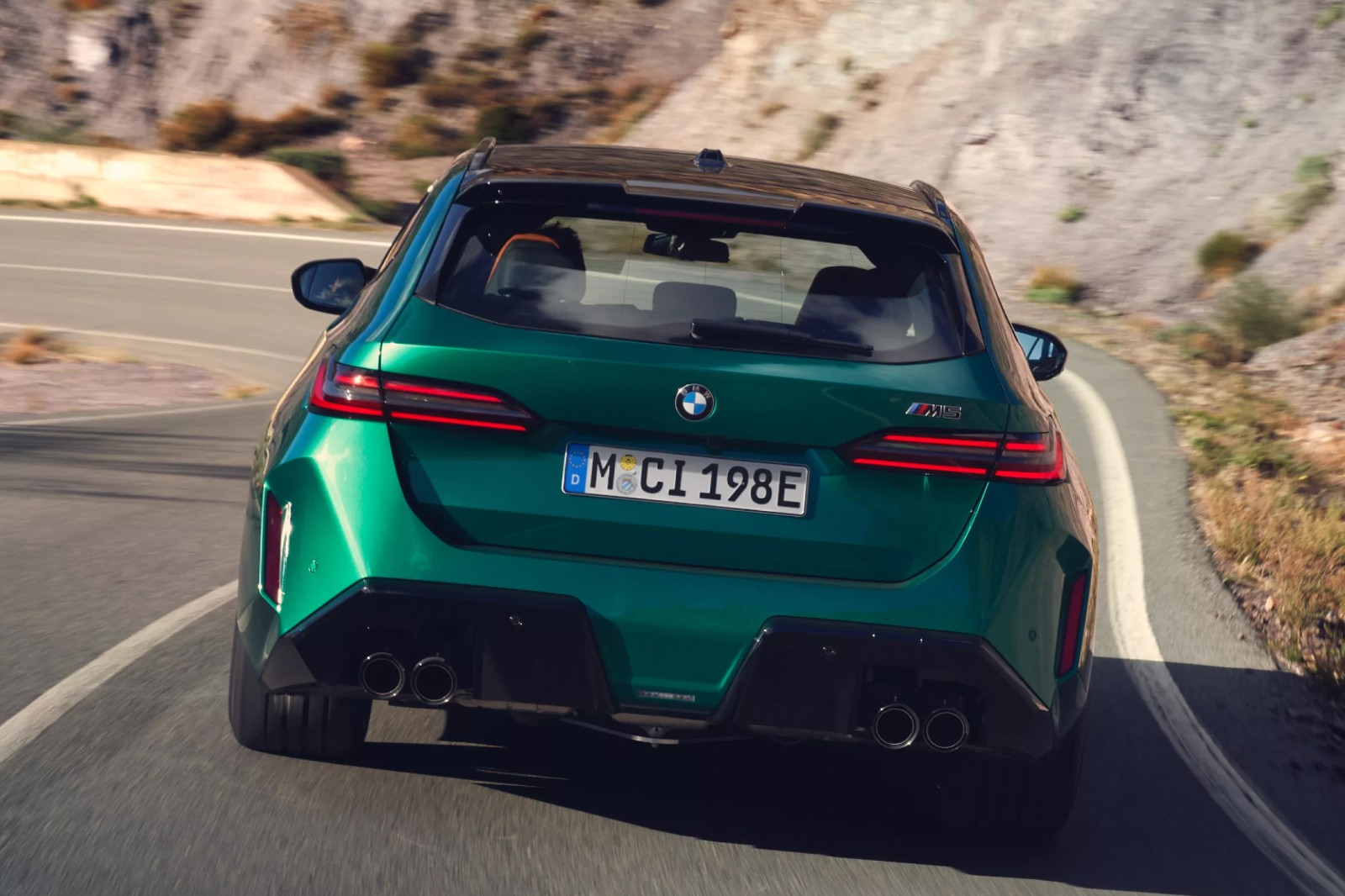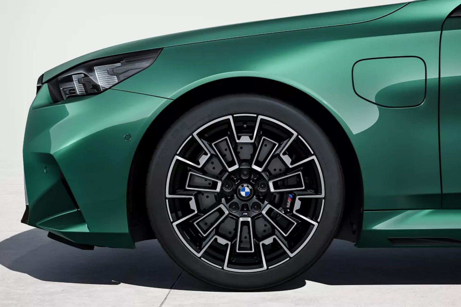 จากภายนอก BMW M5 Touring สะท้อนถึง DNA ของ M อย่างไม่ต้องสงสัย ด้านหน้าโดดเด่นด้วยกระจังหน้าทรงไตคู่แบบ M ที่ได้รับการปรับปรุงใหม่ กว้างขึ้นและดุดันยิ่งขึ้น พร้อมช่องรับอากาศที่ออกแบบมาเพื่อการระบายความร้อนและเพิ่มประสิทธิภาพด้านอากาศพลศาสตร์ กระจกบังลมและล้อขนาดใหญ่ช่วยเสริมความแข็งแกร่ง ในขณะที่ไฟหน้า LED เลเซอร์อันเป็นเอกลักษณ์ของ BMW มอบทั้งสัญลักษณ์ทางสายตาและความรู้สึกไฮเทค เมื่อมองไปตามด้านข้าง สัดส่วนของรถนั้นยาวและสง่างาม เส้นสายตาทอดยาวจากด้านหน้าไปด้านหลัง สื่อถึงความรู้สึกของการเคลื่อนที่ไปข้างหน้าแม้ในขณะจอดนิ่ง ฝากระโปรงท้ายทรงกลมช่วยให้มองเห็นถนนได้เล็กน้อย ด้านล่างเป็นสเกิร์ตข้างและกระจังหน้าสีดำเงา รายละเอียดที่โดดเด่นที่สุดคือซุ้มล้อที่กว้าง ครอบด้วยล้ออัลลอย M แบบ Y-spoke ขนาด 20 หรือ 21 นิ้ว ในสีต่างๆ เผยให้เห็นเบรก M ขนาดใหญ่สีแดงหรือสีเงิน ไฟท้าย LED ทรงเพรียวบางเชื่อมต่อกันด้วยแถบสีดำเงาและท่อไอเสียกลมชุบโครเมียมสีดำสี่ท่อจากระบบท่อไอเสียปรับได้ M Sport สร้างความโดดเด่นสะดุดตาและส่งสัญญาณที่ทรงพลัง การออกแบบโดยรวมสื่อถึงพละกำลังและความพร้อมสำหรับการเดินทางไกลพร้อมสัมภาระเต็มพิกัด โดยไม่ลดทอนความสปอร์ตลงแม้แต่น้อย