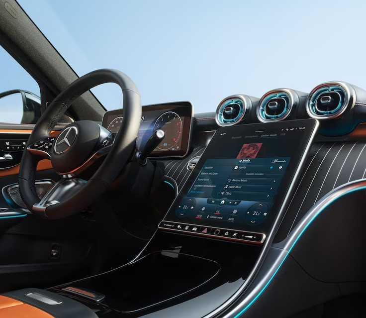 ภายในห้องโดยสารของ C-Class ออกแบบมาอย่างหรูหราและเต็มไปด้วยเทคโนโลยีขั้นสูง แผงหน้าปัดดิจิทัลขนาดใหญ่ MBUX ทัชสกรีนระบบเสียงเบอร์ลิงตัน และวัสดุหุ้มเบาะหนังคุณภาพสูง ทำให้การขับขี่และการพักผ่อนเป็นประสบการณ์ระดับพรีเมียม