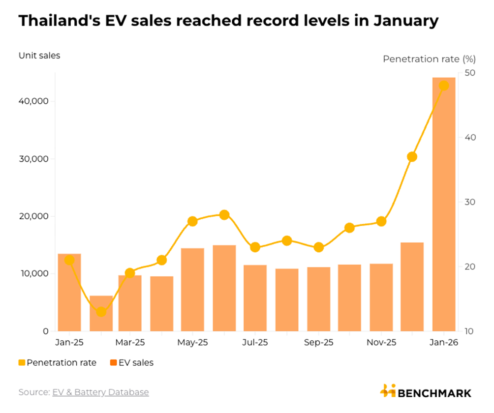 ตลาดรถยนต์ไฟฟ้า (EV) ไทย เปิดปี 2026 แบบร้อนแรงเกินคาด เมื่อยอดขายรถยนต์ไฟฟ้าประเภท Passenger Car และ Light Duty Vehicles ในเดือนมกราคมพุ่งทะลุ 44,000 คัน เพิ่มขึ้นมากกว่า 3 เท่า เมื่อเทียบกับช่วงเดียวกันของปีก่อน ถือเป็นสถิติสูงสุดรายเดือนของประเทศ