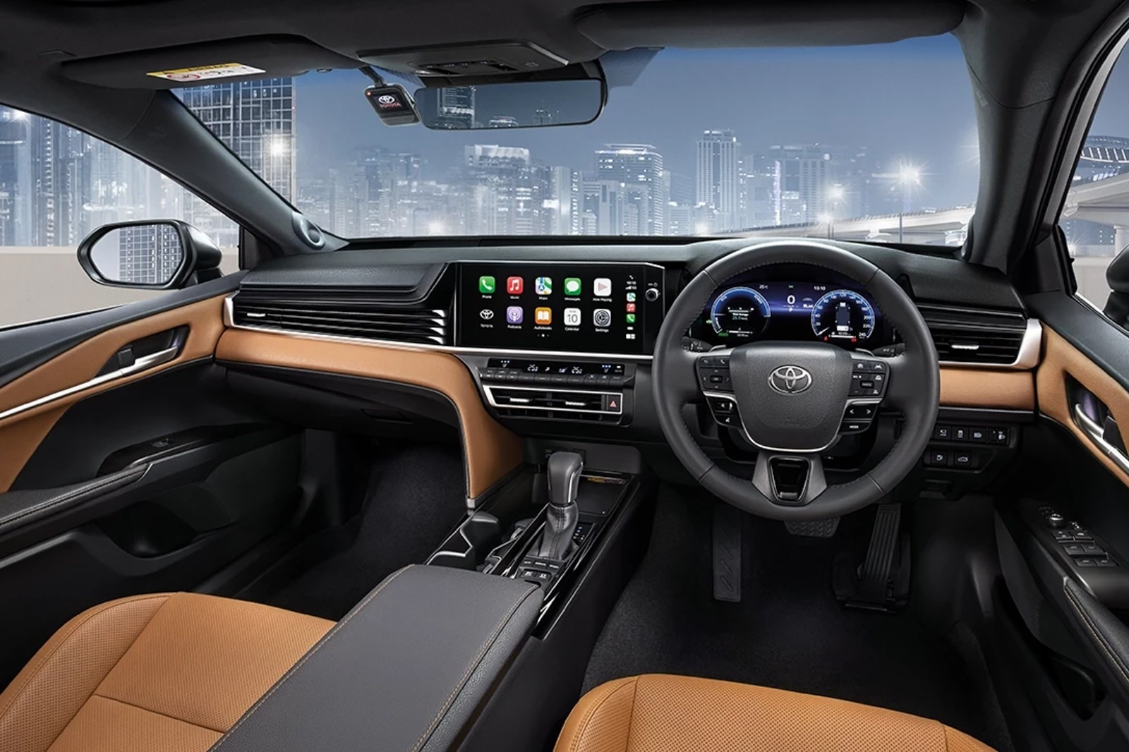 Toyota Camry ออกแบบภายในด้วยแนวคิดที่เน้นความใช้งานได้จริงและความสบายเป็นหลัก ใช้วัสดุคุณภาพสูงและการผลิตที่ประณีต สไตล์โดยรวมเรียบหรูดูดี หน้าปัดกลางจัดวางปุ่มกดอย่างเป็นระบบ ใช้งานง่าย พร้อมหน้าจอสัมผัสขนาด 8 หรือ 9 นิ้ว (ขึ้นอยู่กับรุ่น) ที่รองรับทั้ง Apple CarPlay และ Android Auto เพื่อความสะดวกในการเชื่อมต่อโทรศัพท์ เบาะนั่งใช้วัสดุระดับพรีเมียมทั้งผ้าและหนังแท้ ให้ความรู้สึกนั่งสบายทั้งการรองรับและโอบก้านร่างกาย แม้ขับทางไกลก็ไม่เมื่อยล้า มีให้เลือกหลายโทนสี เช่น ดำ ครีม และแบบสองสี เพื่อตอบโจทย์ความชอบที่แตกต่าง นอกจากนี้ Camry ยังติดตั้งระบบปรับอากาศอัตโนมัติ 2 โซน ชาร์จไร้สาย ระบบเสียง JBL (ในรุ่นสูง) เพื่อเพิ่มประสบการณ์การขับขี่ การออกแบบช่องเก็บของก็ใส่ใจผู้ใช้ มีช่องเก็บของทั้งใต้หน้าปัดกลางและประตู เพียงพอต่อการจัดเก็บสิ่งของส่วนตัว โดยรวมแล้ว ภายในรถ Camry ไม่เพียงแต่ใช้งานได้ดี แต่ยังให้ความรู้สึกมีระดับและทันสมัยในทุกรายละเอียด